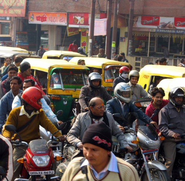 driving any vehicle, or being a passenger in any vehicle in india, is a lot like getting off the plane in india. it's a surge. with lots of horn blowing, bell clanging and squeaky toy sounds. every red light is like the line up at the indi 500 . . . engines roaring and vehicles straining for the green. the moment the green appears, the sound of the horns and blowers reaches a climax and the entire block of waiting traffic surges forward at full speed in every direction. lanes lines are for decoration only and it's not unusual at all to see trucks, cars, motorcycles, rickshaws and bicycles barreling down the "wrong" side of the road at break-neck speed. i've finally realized that all the horn blowing and squeaky tooting operates like sonar on a bat, giving each driver a sense of his location in the pack as he accomplishes seemingly impossible feats of intricate traffic negotiation. what's amazing is that you almost never see an accident - and - as a pedestrian, you'll never be run over as long as you walk directly where you want to go. oh, i forgot to mention that in india, you don't walk on the sidewalk (it's too lonely up there) you always walk in the street (adds to the fun). important to remember, as a pedestrian, never hesitate or change direction suddenly. the drivers' sonar has you placed for passing within 4-6 centimeters and your uncertainty could set a whole new cacophony of horn blowing, bell ringing and squeaky toy tooting into action, thereby throwing off the balance of traffic for a radius of at least a hundred kilometers.