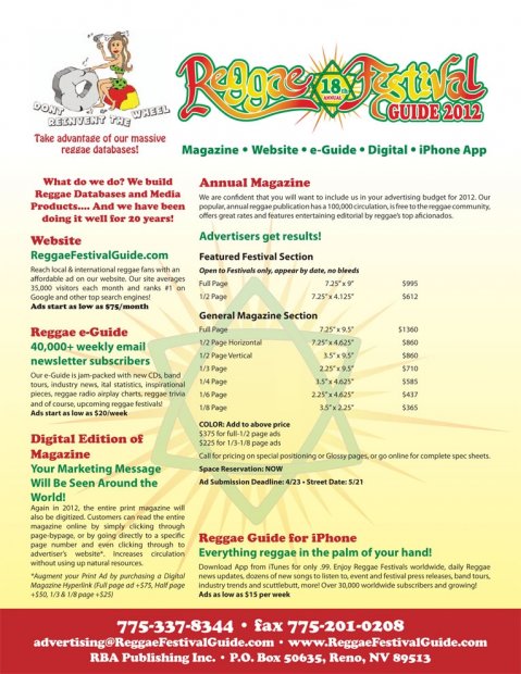 RBA Publishing Inc is home-based and women-run with headquarters in Reno, NV. We produce the annual Reggae Festival Guide print magazine (now approaching its 18th year), the top-ranking website: www.ReggaeFestivalGuide.com, and this weekly reggae newsletter: The Reggae E-Guide has just under 40,000 weekly subscribers.