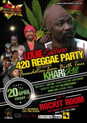 2004 marked the limited release of THE UPRISING on Reggae Central Records to critical acclaim but suffered from poor distribution. That wrong has been righted in 2010 with the digitally remastered release of THE UPRISING on Culture’s own Gangalee Music label, distributed by Zojak World Wide. Alive set recorded in London is also slated for release this month – LOUIE LIVE IN LONDON - with a brand new album to follow in August. Now fans worldwide can appreciate the tremendous growth of his lyrical creativity along with the strong vocal styles which distinguish Louie Culture as more than just a chanter, 2012 truly looks to be Louie Culture’s year to shine his light as fans can see him on the Foundation from Birth Tour 2012. To purchase, listen or view to Louie Culture music visit http://www.reverbnation.com/louieculture & http://www.facebook.com/#!/Gangaleemuzik?sk=infoFor booking info contact Postman Ali at (510)759-1091 or Email me at knakdemout@gmail.com