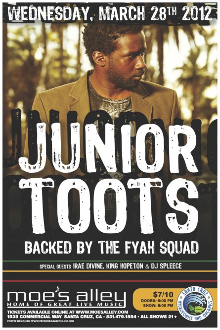 JUNIOR TOOTS live @ Moe's Alley (Santa Cruz) - 1535 Commercial Way Wednesday, March 28th backed by the FYAH SQUAD band plus special guests Irae Divine, King Hopeton, Sol Atash & DJ Spleece Doors at 8:00pm, Showtime 9pm ($7 advance / $10 door)