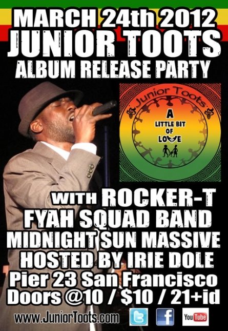 JUNIOR TOOTS live @ Pier 23 (San Francisco) - on the Embarcadero Saturday, March 24th with special guests - Rocker T both backed by the FYAH SQUAD band opening band: Midnight Sun Massive (band out of the Santa Rosa area) also performing: - Bishop Gad (on tracks) - Sol Atash (who sings in Farsi - the language of Iran - and on one of Junior Toots' songs) Dj selections by Irie Dole (of the #1 sound system in the Bay Area: Jah Warrior Shelter Hi-Fi)