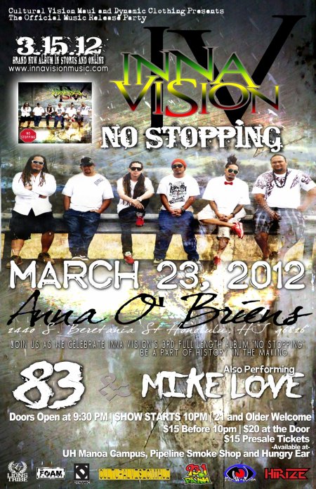 The outcome of this re-construction is a 13 track full length album rightfully titled, No Stopping. No Stopping is a representation of the band’s growth and maturity, and love for authentic reggae music. All members have grown in a level of superior musicianship, which you will be able to hear in the recordings and see in live performances. No Stopping was recorded at Cultural Vision Maui Studio, released under Inna Vision’s label Cultural Vision Maui and will be available world-wide in Spring 2012.