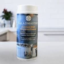 . KEEP YOUR COOKWARE LOOKING ITS BEST! Golden brown or blue heat tints may result from overheating. White spots may occur from minerals present in food or water. These temporary blemishes can be removed easily by following the procedure below. Rinse utensil with warm water. Create a paste-like mixture using a small amount of water and a non-abrasive stainless steel cleanser such as Surface Master by Saladmaster. DO NOT use a cleanser containing chlorine bleach. Apply paste with a sponge or cloth and rub lightly in a circular motion. Wash, rinse and dry. Note: Dishwasher cleaning will not completely remove heat or food films left on utensils. Remove films by following the directions above before dishwasher cleaning.