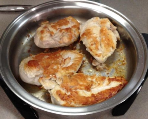 - Place chicken in skillet; it will initially stick.
