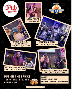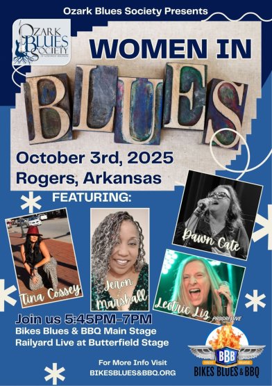 October 3rd the Women in Blues take to the stage for a night of Blues you won't want to miss. Join us at the Railyard Live at Butterfield Stage in Rogers featuring Tina Cossey, Jeron Marshall, Dawn Cate, and Lectric Liz Lottmann from 5:20-6:30! Then on October 4th at the Railyard Main Stage in Rogers, it’s the OBS BIG BLUES JAM! Featuring: Opener by YONDER’S WALL, followed by an All Star Core Band with TONY REDMAN, GARY HUTCHISON, RANDY McALLISTER, KELLY ANDERSON, JOHN DAVIES, MIKE RUDOLPH, ANDY OBERG