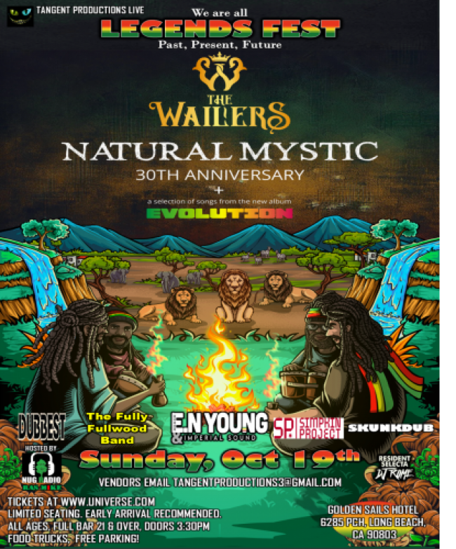 Released on May 23, 1995, Natural Mystic: The Legend Lives On serves as an addendum to the 1984 compilation album Legend. While Legend primarily features love songs, Natural Mystic delves into Bob Marley's more politicized and religious-themed works, providing a balanced perspective of his musical legacy. The album opens with the title track "Natural Mystic," where Marley warns of the need to "face reality now" amidst global upheaval and change. Other notable tracks include "Africa Unite," "So Much Trouble In The World," and "Iron Lion Zion," each exploring themes of unity, societal challenges, and personal resilience. Under the skilled leadership of Aston Barrett Jr., son of the legendary Aston "Familyman" Barrett, The Wailers continue to preserve and enrich their timeless sound, bringing fresh energy and charisma to their electrifying performances. As The Wailers embark on their 2025 tour, audiences can anticipate a full live rendition of Natural Mystic: The Legend Lives On, bringing its classic tracks to life on stage, alongside other classics and select tracks from the Grammy-nominated Evolution. This tour promises a unique blend of nostalgia and contemporary reggae rhythms, making each concert an unforgettable experience. Don't miss this opportunity to witness The Wailers as they celebrate the rich legacy of Natural Mystic: The Legend Lives On while showcasing the groundbreaking artistry of Evolution. Join us for a tour filled with love, unity, and the powerful, uplifting vibes of reggae. The Wailers are back, bringing their A-game to stages across the world! E. N Young- Performing since he was 15 years old with several studio albums won the San Diego Music Award in 2009, and has played onstage with many influential reggae artists including Quino Big Mountain, Johnny Clarke, Sammy Dread, Sister Nancy, Anuhea, Carlton Livingston, Don Carlos, Slightly Stoopid, Tribal Seeds and more. Dubbest—originally from the Boston area, formed in 2009 by close school friends. Moving from Boston to San Diego in 2016, Dubbest has carved out their place in the Cali scene with soulful harmonies and a heavy roots reggae sound. Having toured the nation with acts like Fortunate Youth, Kbong & Johnny Cosmic, Arise Roots, Bumpin Uglies, Passafire, The Expanders, and many more, the group has further developed their live sound through constant improvement. The Fully Fullwood Band—Fully Fullwood is a truly well-earned recognition as being one of "the Greats" of the music industry, deeply creative and positively innovative—one of the most popular and well-known bass players in the world and has worked and recorded with every major artist out of Jamaica. His list of credits reads like a who's-who of the 20th century's most important musical artists Bob Marley, Peter Tosh, Michael Rose, Mikey Dread, The Mighty Diamonds, Black Uhuru, Joe Higgs, Dennis Brown, Gregory Isaacs, Frankie Paul, Big Youth, U-Roy, Sister Carol, John Holt, Judy Mowatt, Ken Boothe, Andrew Tosh, Delroy Wilson, and many more have utilized the outstanding talents of this absolutely amazing composer, producer and musician. The originator and leader of the "Soul Syndicate Band," Fully Fullwood has the distinction of also being a member of reggae superstar Peter Tosh's famous band, "Word, Sound and Power" whom he recorded with and also toured with extensively. Simpkin Project—is renowned for their distinctive fusion of reggae and roots rock, skillfully intertwining authentic rhythms with a captivating wall-of-sound production style. Frontman Phil Simpkin's lyrical compositions range from simply truthful to stirringly anthemic. Their rich guitar work, influenced by blues and rock 'n' roll, blends seamlessly with thumping drums, bass, percussion, and rhythmic guitar—a homage to Jamaica's celebrated music. Lush keyboard arrangements create a vibrant backdrop, enhancing the brilliance of three-part vocal harmonies. Their unwavering dedication to reggae is evident in dynamic live performances, songwriting, and studio recordings. Skunkdub—is a soulful California Reggae artist with a distinctly classic rockers dub sound. Accompanied by his band, The High Influence, Skunkdub is most known for his melodic, psychedelic, high-energy live performances. Follow Tangent Productions on Facebook: Facebook
