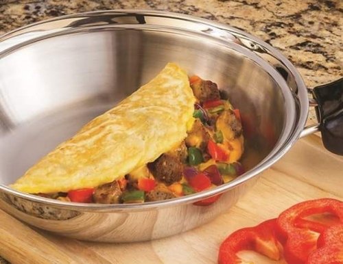 Omelet 2 whole eggs 2 tbsp water Directions : Preheat the omelet skillet for 3 minutes over medium-low heat (approximately 250°). Add a little butter or spray oil in the heated skillet. Immediately break desired number of eggs open in the bowl. Add water and whisk together until thoroughly blended. Pour egg mixture in the skillet add the veggies/ cheese on top of the eggs. Place the lid on the skillet and cook approximately 3 minutes until there is no liquid remaining, or to desired texture. Flip half of the omelet over and cook another 2-3 mins. Note: Adding water to the eggs prior to cooking make the eggs fluffy and light. Cooking time may vary depending on the number of eggs cooking. All stoves vary in cooking, so finding the right temperature setting on your stove will make a difference in how easy eggs are to cook and the utensil is to clean.