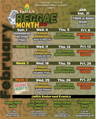 KEY EVENTS & TRIBUTES Tribute to Dennis Brown – Hard Rock Guitar Hotel, Florida — January 31 - Presented in collaboration with Vision Band. Remembering the Crown Prince – EMCVPA — February 1 Staged in collaboration with the Dennis Brown Trust. Back to Bass-es – EMCVPA — February 4 Rocking the Cliff: Tribute to Jimmy Cliff – Coral Cliff, Montego Bay — February 11 Resilient Praise – EMCVPA — February 18 Bands Rewind – EMCVPA — February 25 JaRIA will again partner with the Edna Manley College of the Visual and Performing Arts to stage Reggae Wednesdays, while also expanding the Reggae Open University (ROU) series to tertiary institutions in Kingston, Montego Bay, and Mandeville with a possibility for Port Antonio to be added.