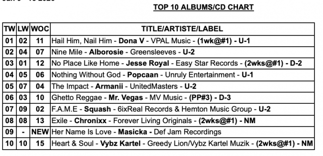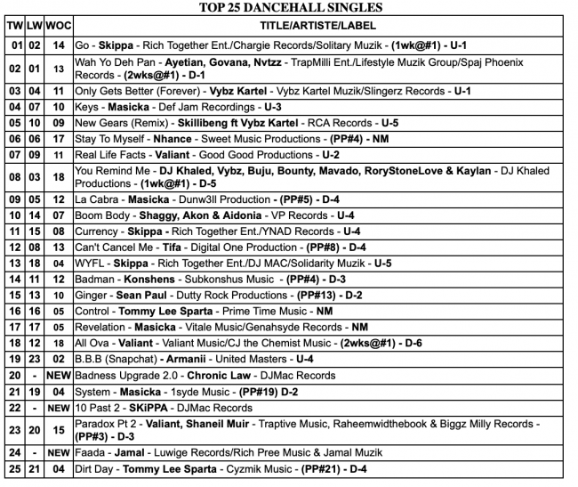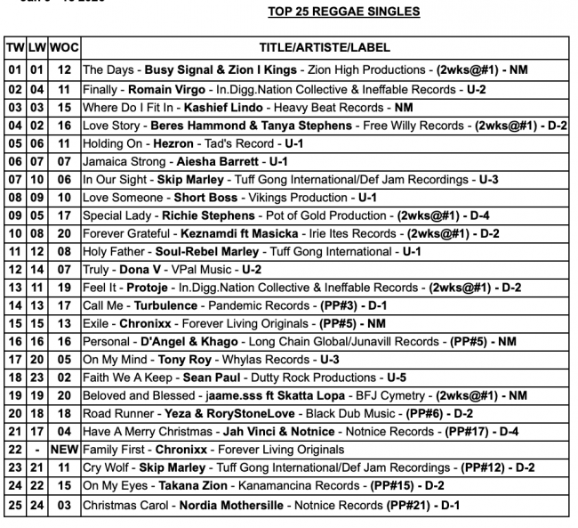 TOP 25 Dancehall Singles,TOP 25 Reggae Singles, and TOP 10 Albums/CD Chart