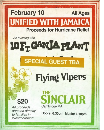 Event Details What: 10 Ft. Ganja Plant Benefit Concert for Jamaica Relief When: February 10th Where: The Sinclair, 52 Church St, Cambridge, MA 02138 Tickets: Available at (Insert Ticket Link/Box Office Info) Purpose: 100% of proceeds go to the families of David Lynch and Monzar Grant.