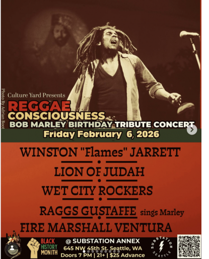 REGGAE CONSCIOUSNESS Bob Marley Birthday Tribute Concert: Looking forward to this celebration & tribute on Reggae Revolutionary Bob Marley's Birthday 📣 Friday February 6 - This 2026 Reggae Consciousness brings together Seattle veteran bands the Wet City Rockers / Fire Marshall Ventura and Lion of Judah Band